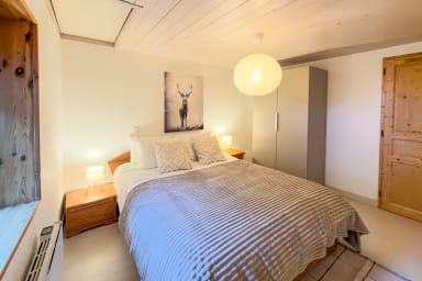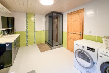 On the next level, the house offers three bedrooms, each with a queen-size bed and storage space. You will also find a bathroom with shower and toilet, as well as a washing machine and a dryer. A balcony completes this floor and allows you to enjoy the fresh mountain air.