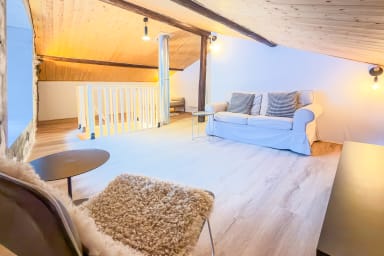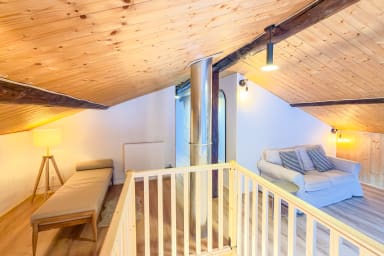 On the top level, a second living area awaits with a sofa and board games. You will also find a fourth bedroom with a queen-size bed, plus its bathroom with shower and toilet.